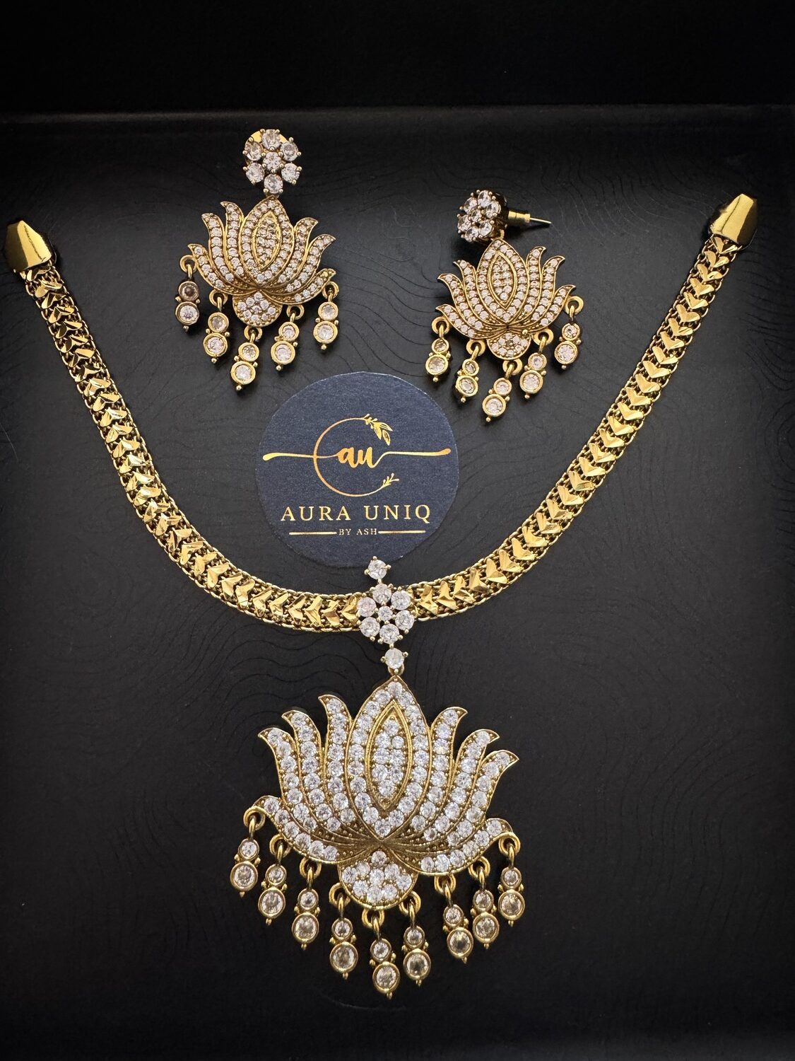 Add a touch of elegance to your look with this beautifully crafted Lotus AD Necklace Set. Designed with sparkling American diamonds and a graceful lotus motif pendant, this set brings together traditional charm and modern shine.
