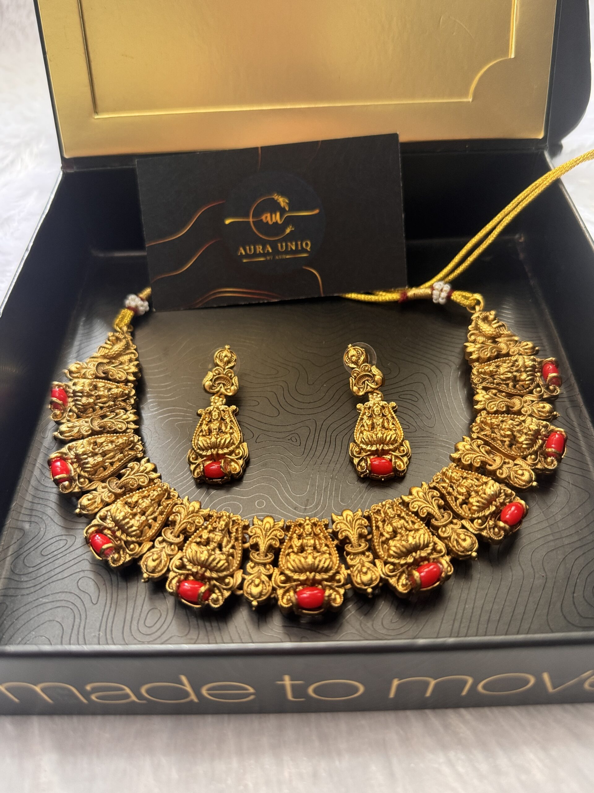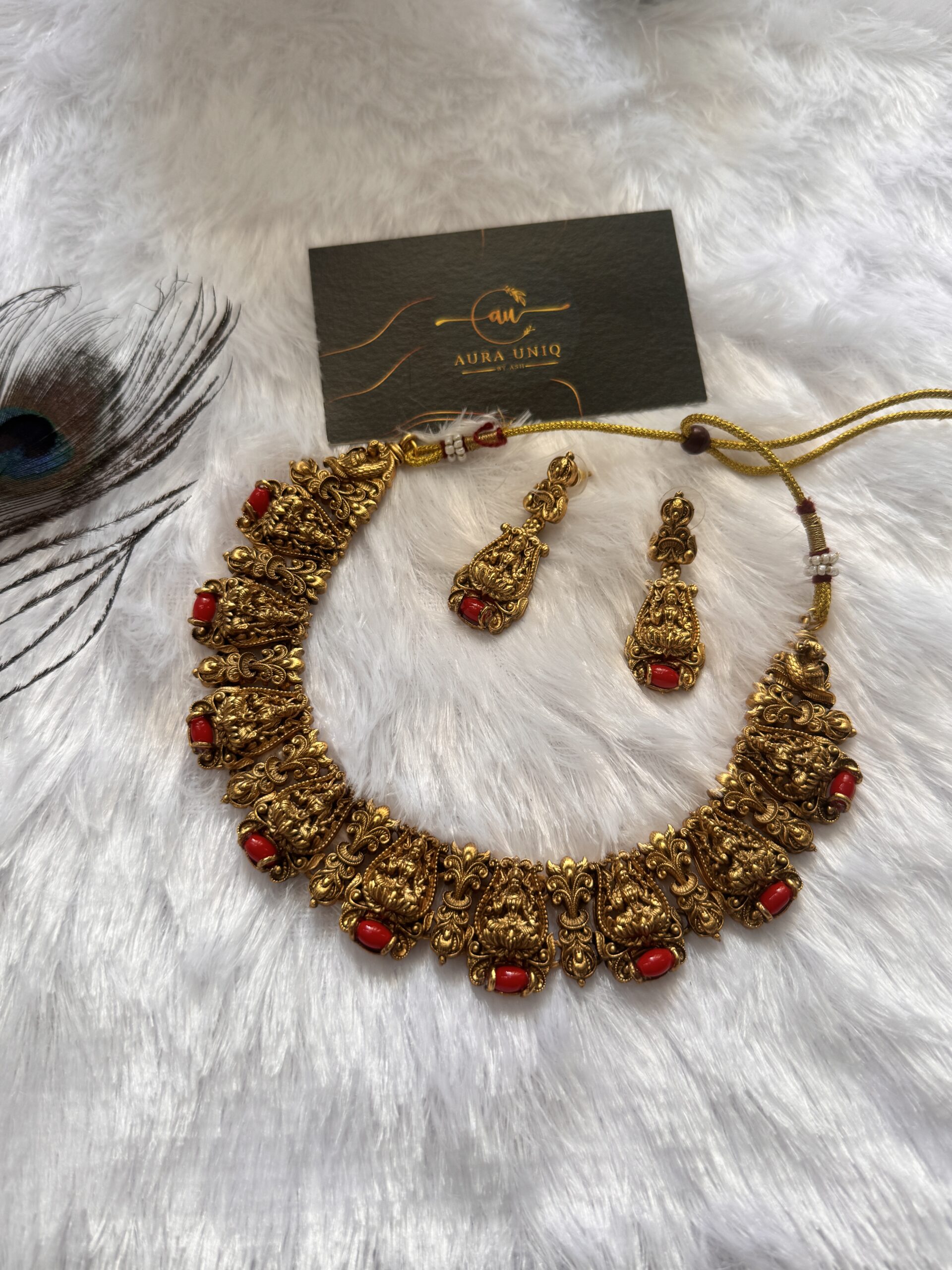 The vibrant coral beads add a bold yet graceful charm, while the Lakshmi pendant symbolizes prosperity and blessings. Pair it with silk sarees or traditional outfits to complete your ethnic ensemble.